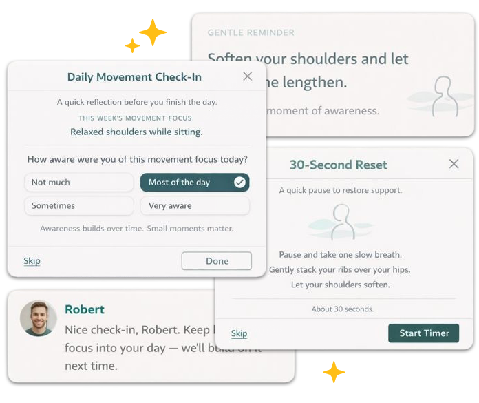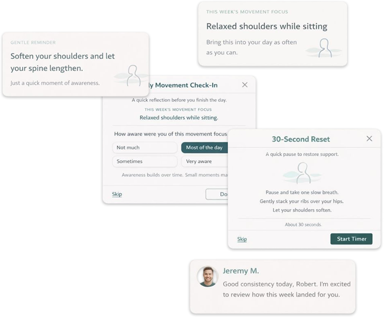 Brief cues, check-ins, and small focus points keep movement top of mind and help new habits form naturally between sessions.